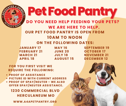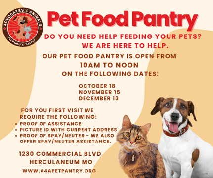 Advocates 4 Animals (A4A) Pet Pantry is a 100% volunteer organization focused on keeping animals with their families during financially difficult times by providing pet food and spay-neuter assistance.